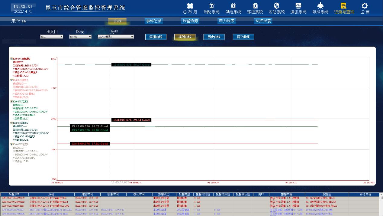 來源于一系列的采樣值,這些采樣值按時間劃分,然后組合成圖形直觀的顯示過程情況。一個繪圖區可對應一個防火分區的各種參數或者一個繪圖區域中可繪制不同防火分區的相同參數的趨勢這樣可以起到直觀的對比效果。