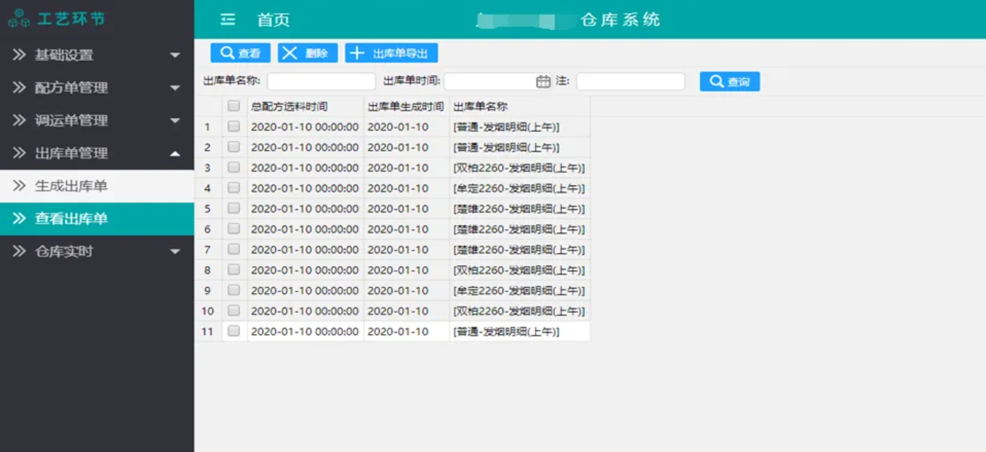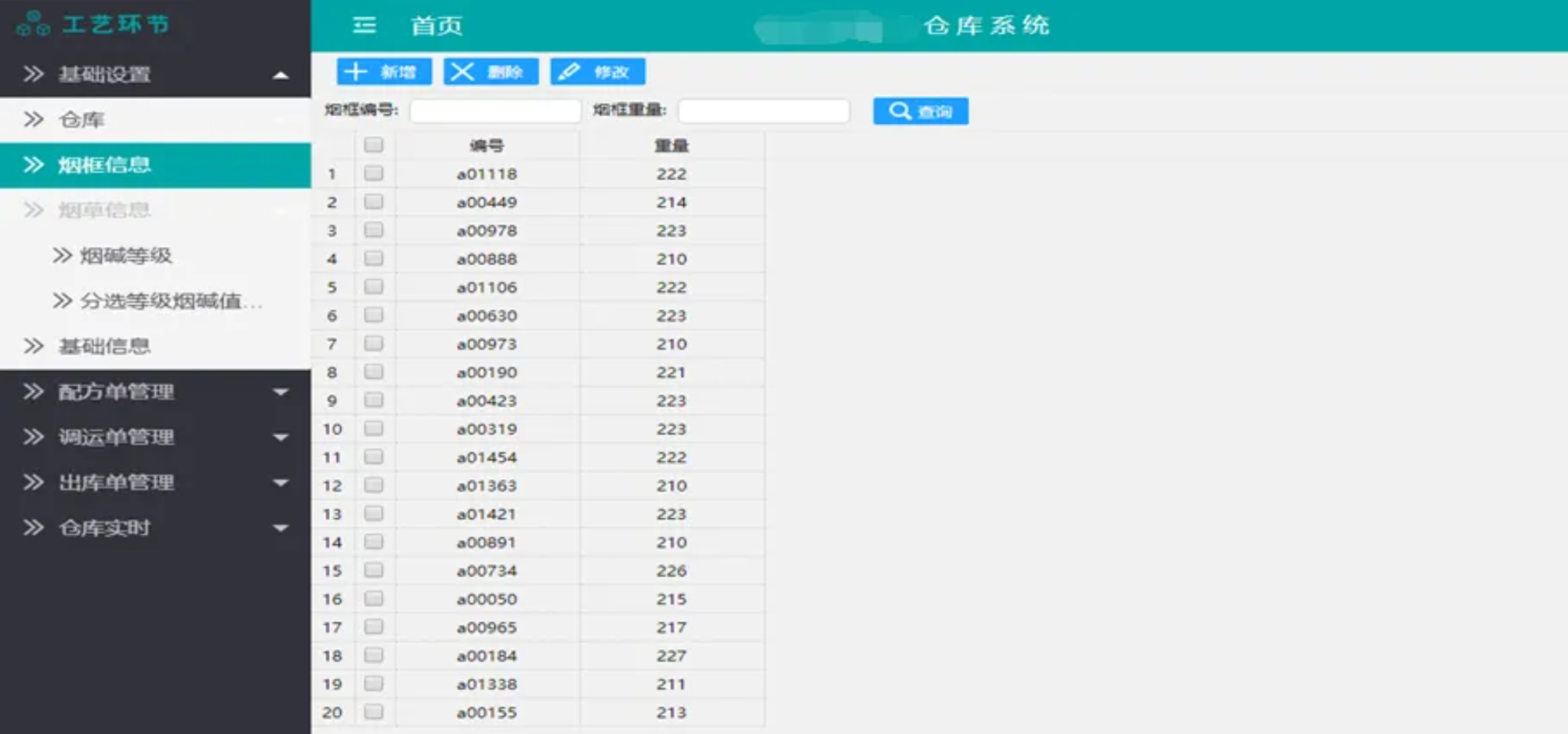 主要包含原煙分選、選葉檢驗、分組縫包、煙包/煙框交接、煙包/煙框入庫、出庫管理、查詢庫存、移庫、備料投料等功能。