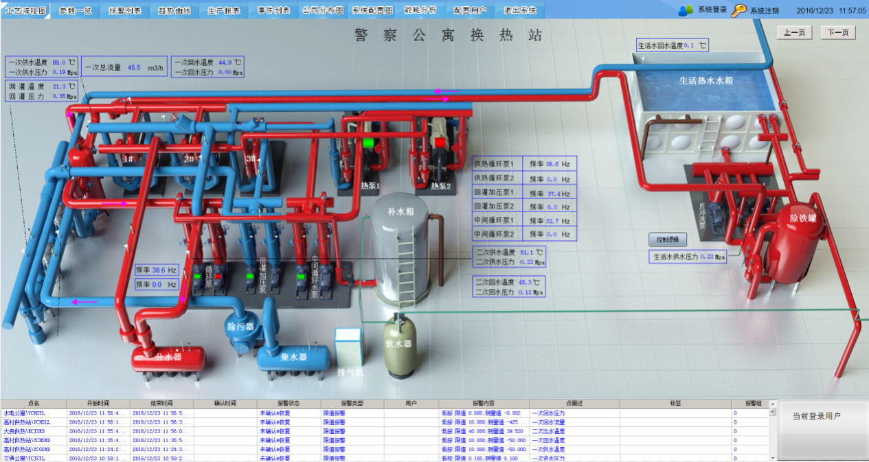 供熱能效考核,提高利潤供熱過程監控可以完成運行管理人員對供熱運行狀態的了解,可以顯示整個供熱系統部分參數運行狀態一覽表,如當前換熱機組的主要運行參數,以及工藝流程圖等,指導相關人員完成生產過程、系統或設備分析,更好地進行操作調整與管理決策。