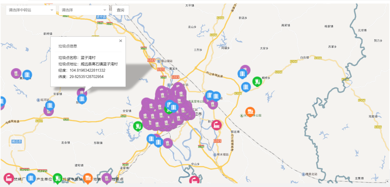 運用圖層技術與數據統計技術展示產生單位分布,結合產生單位的詳細信息和GIS地圖,生產運維人員可以快速查看轉運與產生單位并查看相應信息。