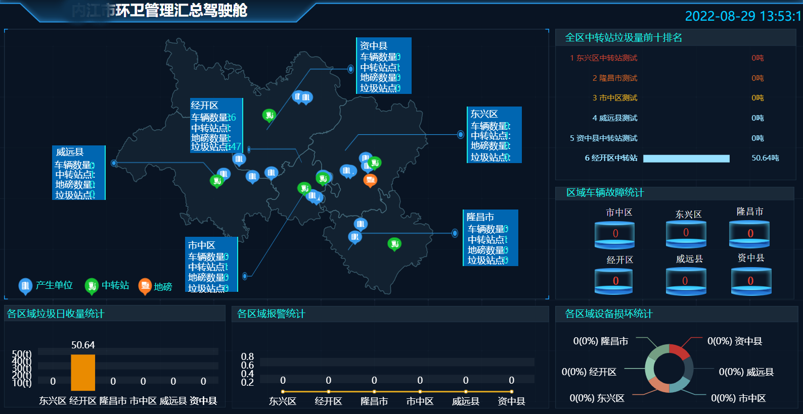對車輛信息、稱重信息、收集信息、轉運信息等進行匯總統計,實時掌握單個中轉站、區域公司以及整個環衛公司內中轉站運轉數據。