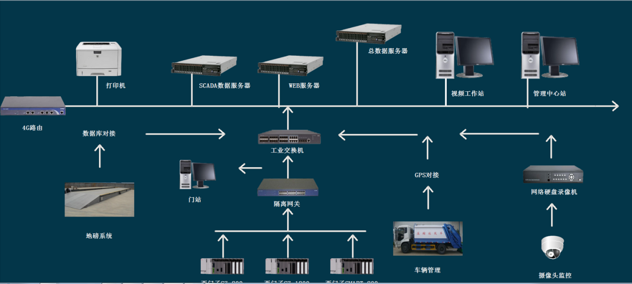 環衛中轉站系統由調度中心級監控系統設備、中轉站控制室監控系統設備、現場測控單元以及網絡系統構成,整套控制系統通過以太網構成通訊網絡,實現全廠的現場數據采集和數據交換。